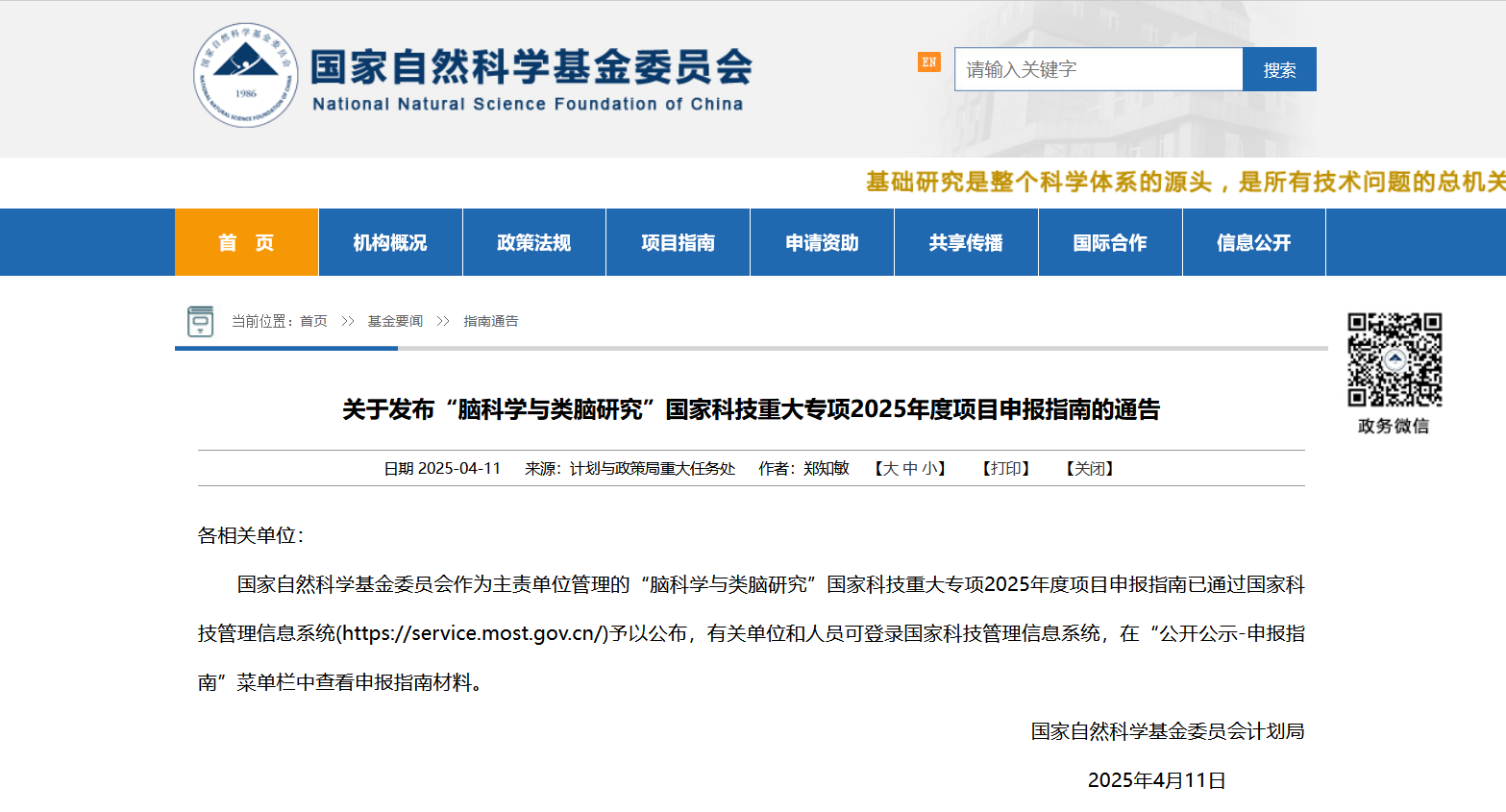 国家自然科学基金委员会作为主责单位管理的“脑科学与类脑研究”国家科技重大专项2025年度项目申报指南已通过国家科技管理信息系统(https://service.most.gov.cn/)予以公布,有关单位和人员可登录国家科技管理信息系统,在“公开公示-申报指南”菜单栏中查看申报指南材料。