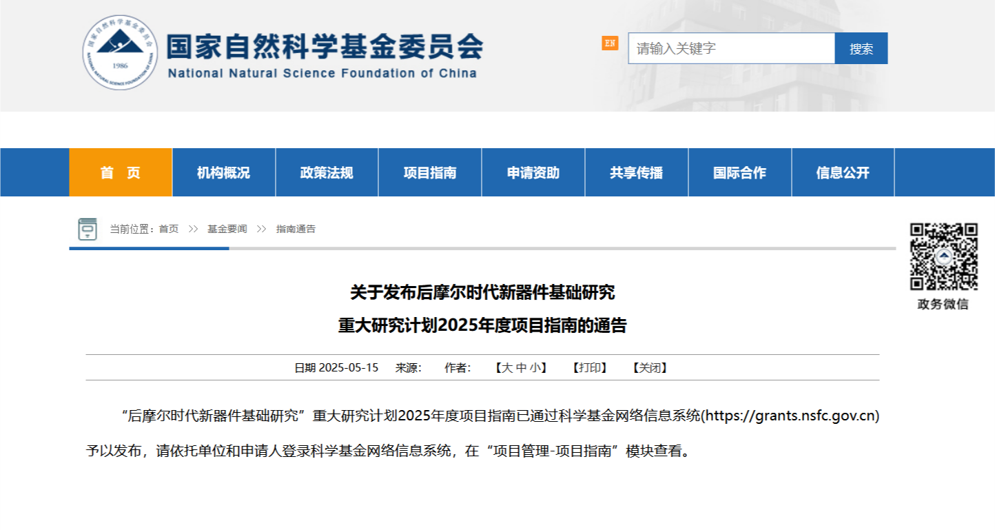 “后摩尔时代新器件基础研究”重大研究计划2025年度项目指南已通过科学基金网络信息系统(https://grants.nsfc.gov.cn)予以发布,请依托单位和申请人登录科学基金网络信息系统,在“项目管理-项目指南”模块查看。