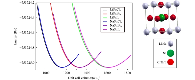 图1 MSnX3(M=Li, Na; X=Cl,Br,I)晶胞体积与立方晶胞能量的关系