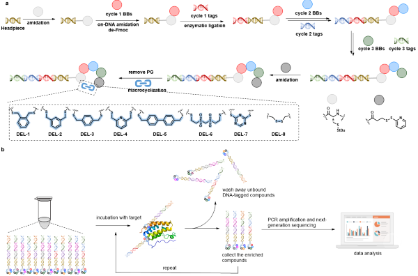 环肽因独特的空间结构和生物活性,在口服药物、多肽偶联药物、诊断试剂等领域展现出应用潜力。然而,如何高效筛选并发现具有优异性质的新型环肽分子一直是药物研发领域的重要挑战。DNA编码化合物库技术(DELT)通过将特定的核酸标签与多肽分子连接,实现大规模化合物库的快速构建和筛选。因此,DELT在引入各类非天然氨基酸和成环方法上具有先天优势,为环肽分子高通量筛选提供了高效、便捷且经济的平台。但是,DELT研究大多采用单一环化策略来构建化合物库和对靶点蛋白进行筛选、验证,这种单一策略通常存在假阳性风险且可能遗漏部分高活性分子,限制了筛选结果的全面性和准确性。