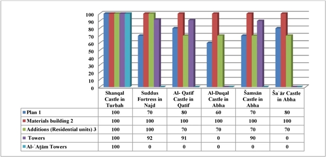 ▲ 图三:图表展示了沙特阿拉伯部分传统城堡实例的总体特征及其与尚卡尔城堡的相似程度。本表中的百分比为近似值,数据基于沙特遗产管理局的统计资料及针对沙特传统建筑的多项研究成果。©本文作者