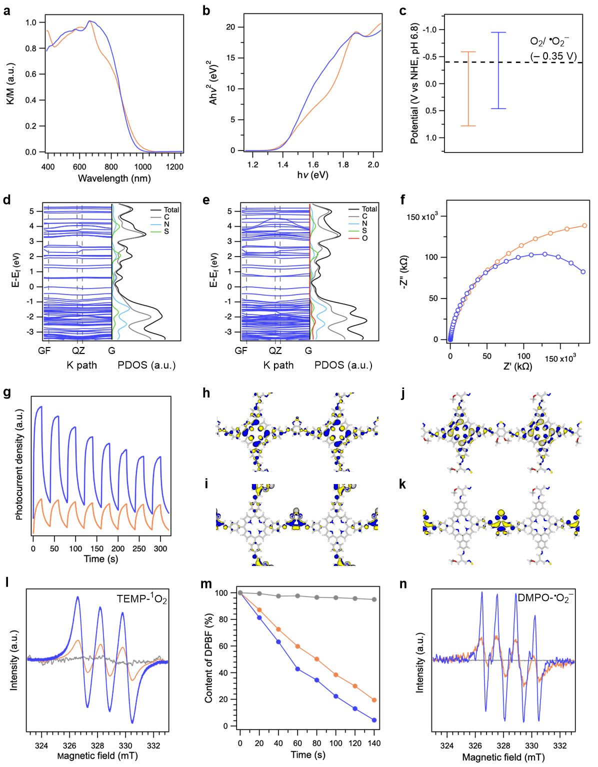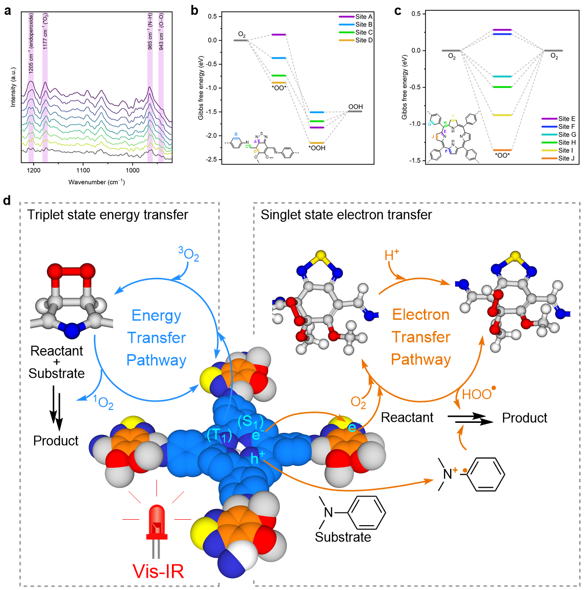为验证其双态光催化性能,研究者通过电子顺磁共振(EPR)、光致发光寿命、瞬态吸收、DRIFTS谱、波前能级计算等手段,系统揭示了其电子转移与能量转移的协同机制。在光照条件下,COF首先被激发至S1态,诱导电子从卟啉迁移至BT(OMe)2生成•O2-,随后通过系间窜越进入T1态,激发氧分子生成1O2。这两个活性氧物种协同完成氧化偶联、缩合反应及C(sp3)–H活化等多个反应步骤。
