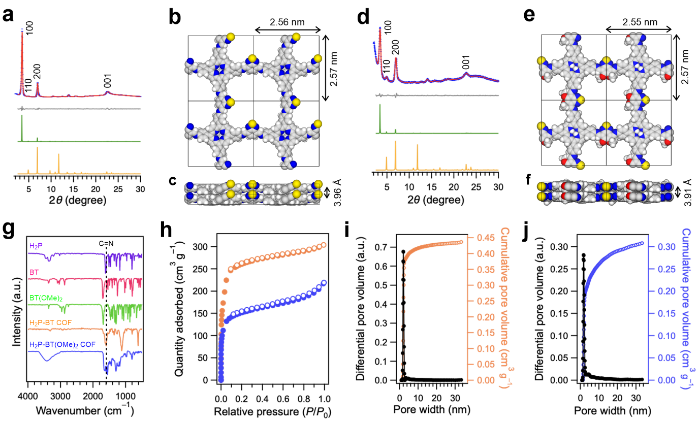 在该研究中,作者将电子供体卟啉(H2P)与电子受体苯并噻二唑(BT)或其二甲氧基衍生物(BT(OMe)2)通过共价连接构筑二维层状COF材料。精确控制的分子结构使供体与受体沿二维平面规则排列,同时在层间形成稳定的π堆积排列。特别地,H2P-BT(OMe)2-COF通过多点氢键网络实现激发态稳定化,并引入极性通道提升反应物传输效率。展现出从可见光延伸至近红外(1000 nm)的宽波段吸收能力,并具备高度有序的层状结构与规则的一维微孔通道,有效促进反应物和氧气的快速运输,为光催化反应提供了理想的空间与动力学条件。
