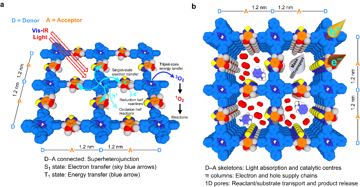 该研究首次实现了在共价有机框架(COF)中协同调动单重态(S1)与三重态(T1)激发能的光催化策略,设计构建了具有双态通道的供体–受体型COFs,打破了以往光催化中只能单一路径激发的限制。新型COF体系不仅展现出优异的光催化效率与反应适应性,还可在无需金属、助催化剂或牺牲剂的条件下驱动多种有机转化反应,开启了COF光催化设计的新方向。
