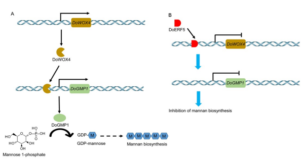 中国科学院华南植物园联合福建农林大学研究团队以铁皮石斛多糖合成途径关键基因DoGMP1启动子为诱饵,利用酵母单杂交文库筛选技术鉴定到一个候选转录因子DoWOX4。进一步研究表明,DoWOX4直接与DoGMP1启动子结合并激活其表达。DoWOX4过表达促进甘露聚糖积累,而沉默DoWOX4则会抑制DoGMP1表达和甘露聚糖合成。此外,研究发现乙烯响应因子DoERF5能与DoWOX4启动子结合,负调控DoWOX4的表达,并抑制甘露聚糖的生物合成。