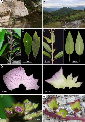 韫珍花(A–E)和吴氏韫珍花(a–e)的生境和形态对比