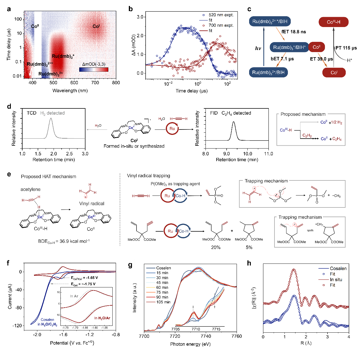 通过结合电化学、原位光谱和密度泛函理论(DFT)计算技术,课题组仔细研究了其优异的光催化性能及其机理,证明CoIII-hydride是乙炔半氢化的关键中间体,该中间体可以与乙炔发生氢原子转移(HAT),从而活化乙炔并驱动半加氢反应的发生。动力学分析证明,这种HAT介导的半加氢机制相比文献报道的乙炔π-络合更具优势,从而加速乙炔转化。最终实现了高选择性的乙炔半加氢(图2、3)。