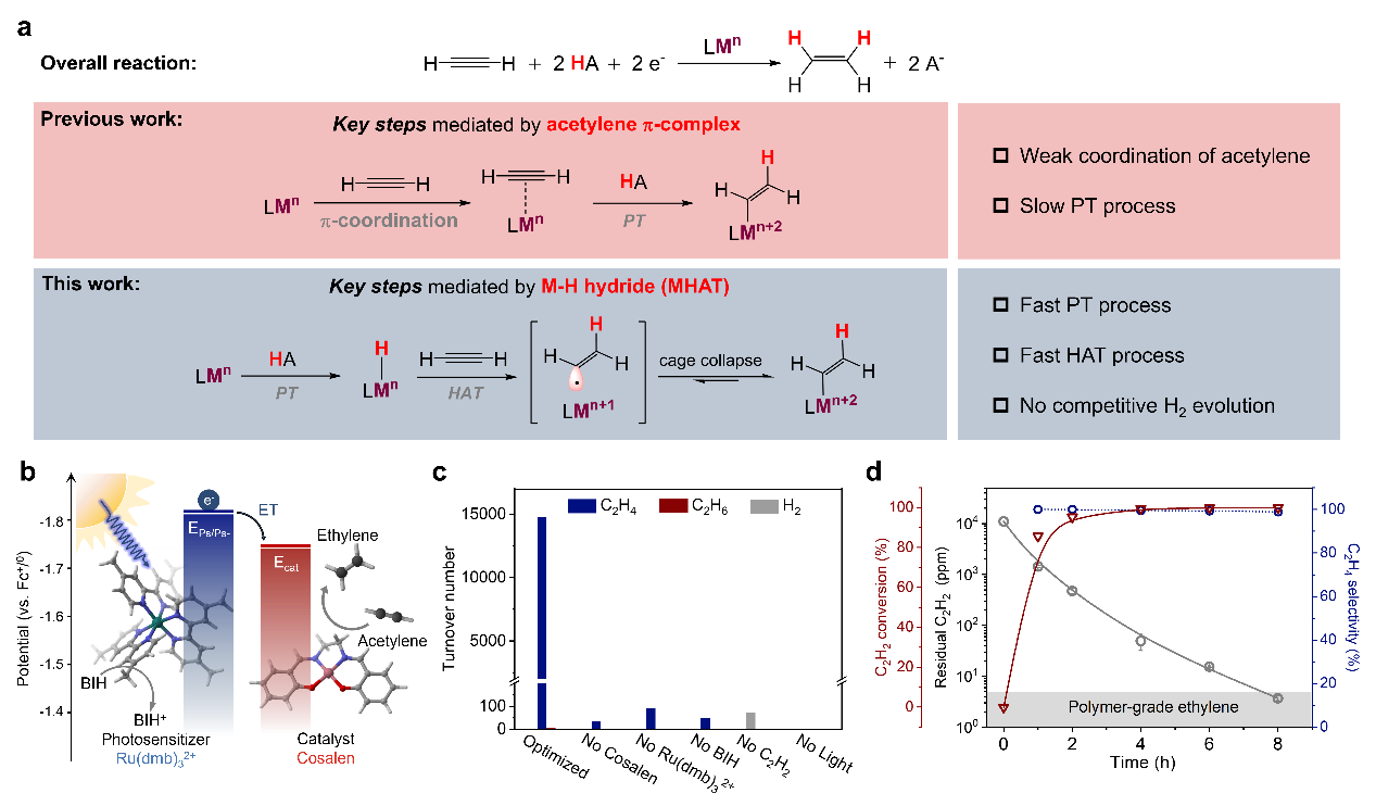 在这项工作中,该团队提出了一种金属催化氢原子转移途径,通过快速形成钴氢化物来促进光催化乙炔半氢化反应。以N,N′-双水杨酰胺乙基钴(Cosalen)为催化剂、微量的水作为氢源,在纯乙炔下获得了99.97%的乙烯选择性,并且乙烯转换数(TON)达到了14791。对照实验表明乙炔的高效转化源自光敏剂、催化剂、牺牲剂BIH的协同作用。通过引入含有1.10 vol. %乙炔的乙烯气体,催化体系实现了99.97%的乙炔转化率和98.99%的乙烯选择性。(图1)。