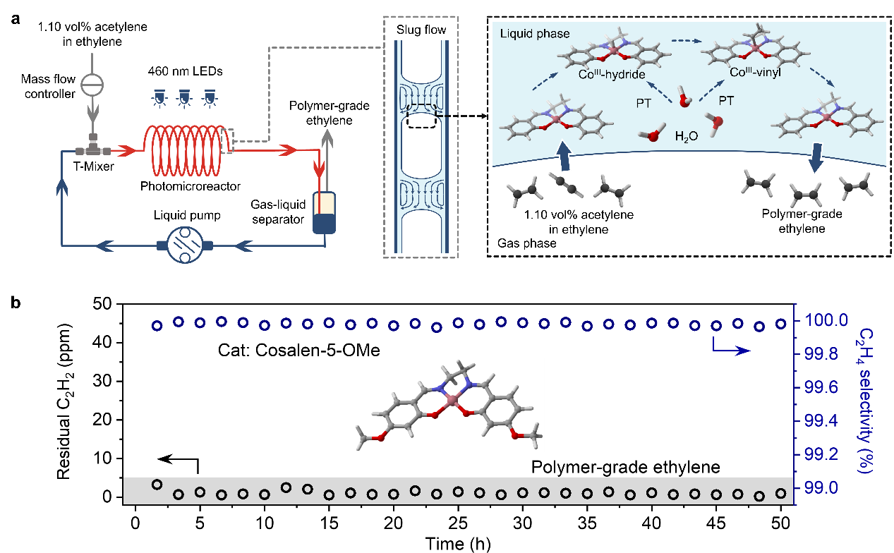 在聚乙烯工业中,通过半氢化粗乙烯中的乙炔杂质来生产聚合物级乙烯具有重要意义。该成果报道了一种利用Co(III)氢化物介导的粗乙烯中乙炔杂质均相光催化半氢化的创新路径。通过采用Cosalen催化剂结合可见光和水,成功将乙炔杂质转化为乙烯,同时有效抑制了副反应。通过连续流策略,极大地提高了光催化效率,能够实现聚合级乙烯(乙炔含量小于5ppm)的连续生产,使得该催化剂体系在粗乙烯的净化中具有良好的实际应用前景。此外,这种光催化流动系统在利用太阳能驱动高效加氢反应以生产高附加值化学品方面具有巨大的应用潜力。