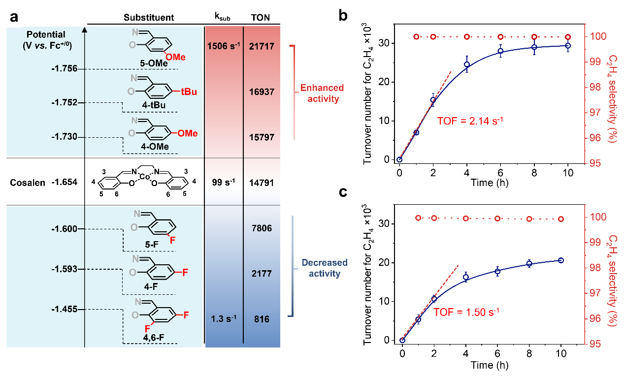 基于对反应机制的理解,作者进一步通过引入给电子配体优化CoIII-hydride形成的热力学能垒,在纯乙炔下获得了更加优异的乙炔到乙烯的还原反应性能,选择性接近100%,转换数达到文献报导的最高值29401,转换频率为2.14 s-1(图4)。对于工业级粗乙烯(含~1%乙炔),该催化剂体系成功地利用可持续的太阳能和水将其转化为聚合级乙烯原料,使得残留乙炔浓度低于5 ppm,所有副反应均得到抑制。