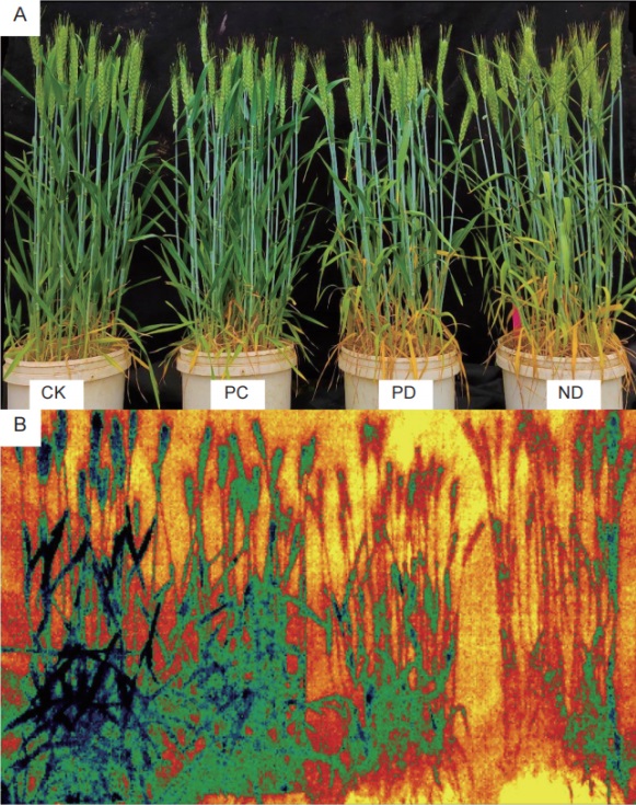 干旱预处理降低小麦在干旱胁迫下的植物温度。CK,未预处理充分灌溉;PC,干旱预处理充分灌溉;PD,干旱预处理灌浆期干旱迫(DS);ND,未预处理灌浆期干旱胁迫。JIA供图