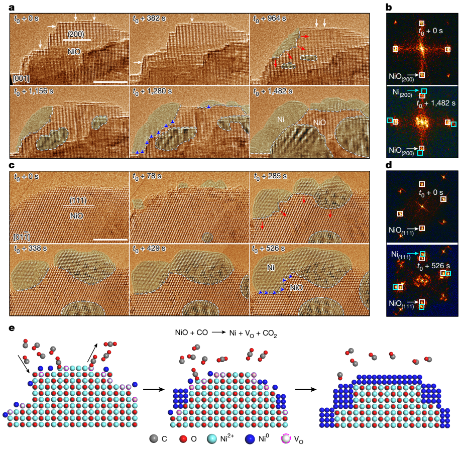 研究团队利用原位环境电镜直接观察到,一氧化碳与氧化镍表面的晶格氧反应,迅速生成金属镍与二氧化碳。然而,随着金属镍逐渐在表面成核和长大,最终形成了一层致密的镍外壳。图1显示了在一氧化碳环境中,氧化镍表面逐渐被金属镍覆盖的动态过程。这一金属外壳阻碍了一氧化碳与氧化物深层晶格氧的接触,使得反应停滞。从而导致还原过程速率显著下降,并且需要更高的温度和能耗才能维持反应。与此同时,这一过程会持续释放二氧化碳,加剧环境负担。