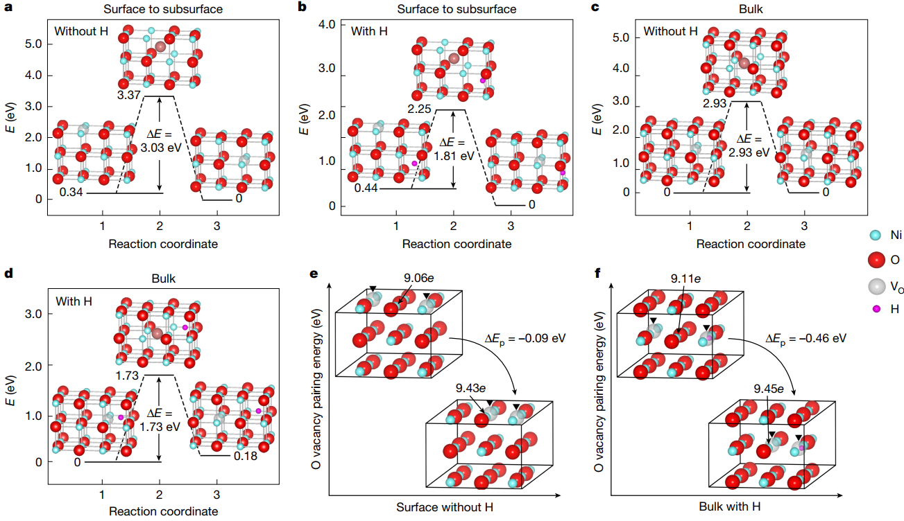 为了进一步验证反应机理,研究团队结合同步辐射X射线衍射、近常压光电子能谱和质谱分析,揭示了氢气与一氧化碳在动力学过程中的本质区别:一氧化碳表现为前期快速还原、后期表面钝化;氢气则表现为前期缓慢孕育、后期快速相变。此外,基于密度泛函理论的计算结果(图3)表明,氢质子的参与可以显著降低氧空位扩散能垒,并促进氧空位的配对反应。这一计算结果与原位电镜观察到的现象高度吻合,进一步印证了氢气独特的绿色还原机理。
