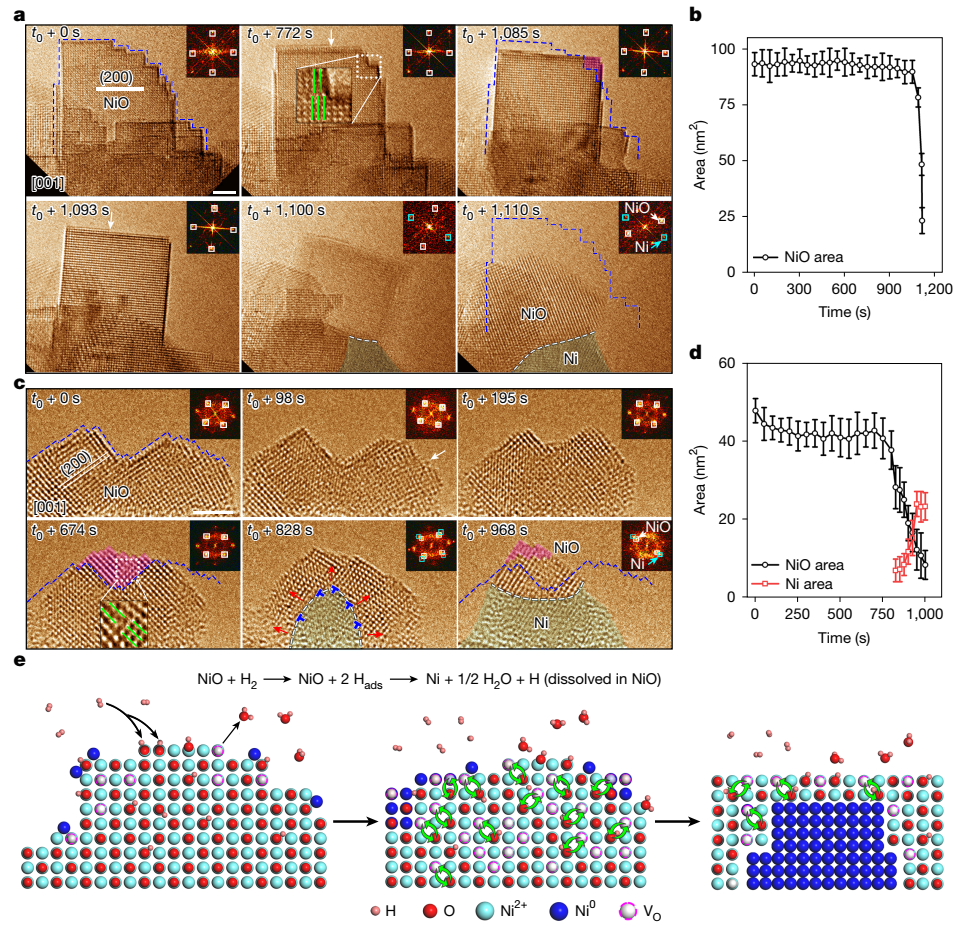 相比之下,当以氢气作为还原剂时,原位环境电镜观察(图2)显示,氢气与氧化镍表面氧反应生成水分子,并在表面形成氧空位进一步向体相迁移,从而在氧化物内部促进金属生成。更为关键的是,氧化物表面仍保持完整与活性,确保了还原过程的持续性。进一步研究阐明,氢质子能够加速氧空位扩散,并可能通过内部氧原子的逆向迁移实现表面再生,展现出一定的自修复特性。这一机制不仅加快了还原反应过程,还延长了催化剂的使用寿命,为实现更加绿色高效的金属提取提供了新的可能。
