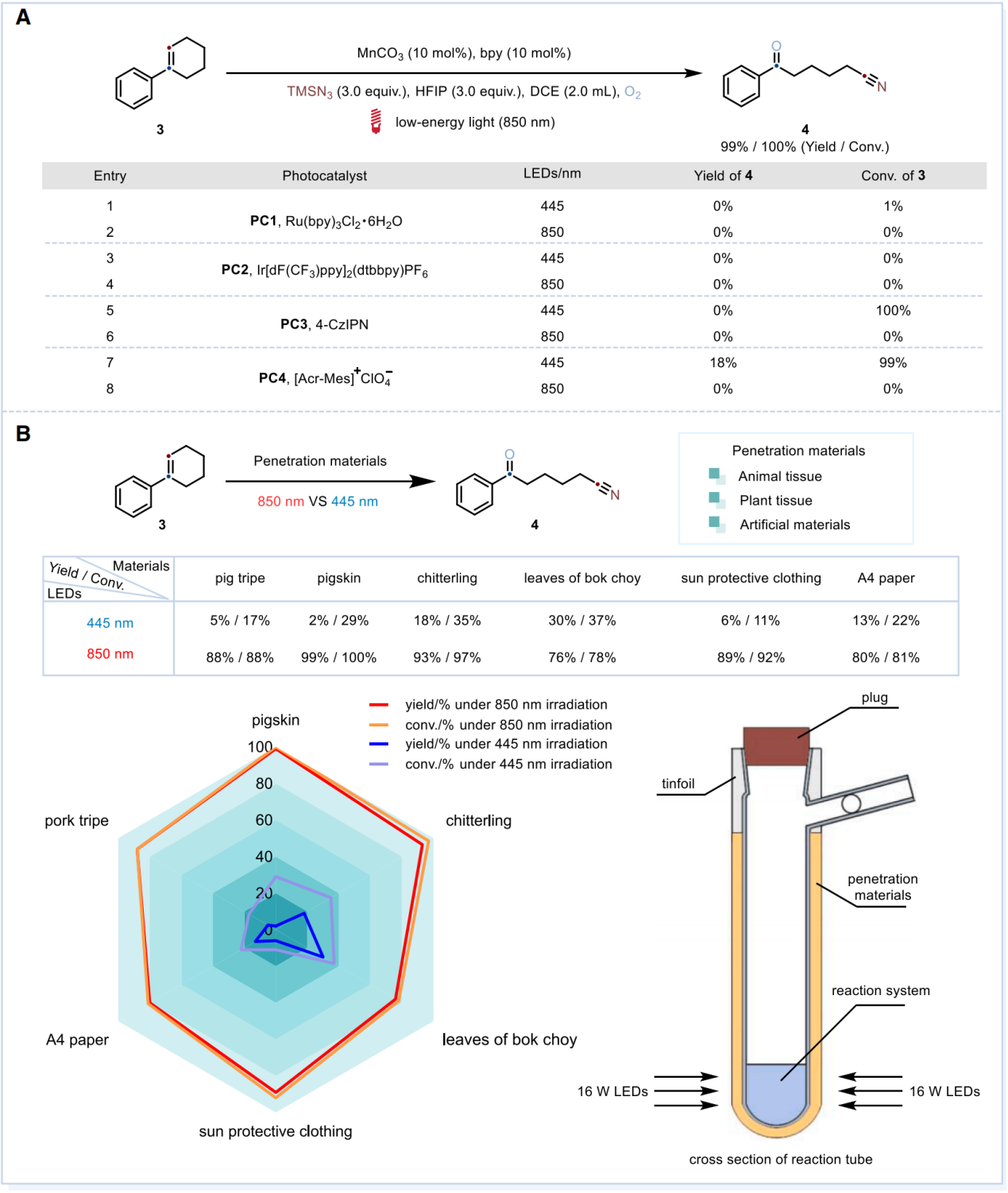 与当前主流光氧化还原催化体系的对比研究表明,该原位生成的锰基低能量光催化平台展现出较强的叠氮自由基生成能力和选择性转化特性。并且穿透实验进一步证实,该体系在生物医学和高分子科学领域具有显著应用优势。
