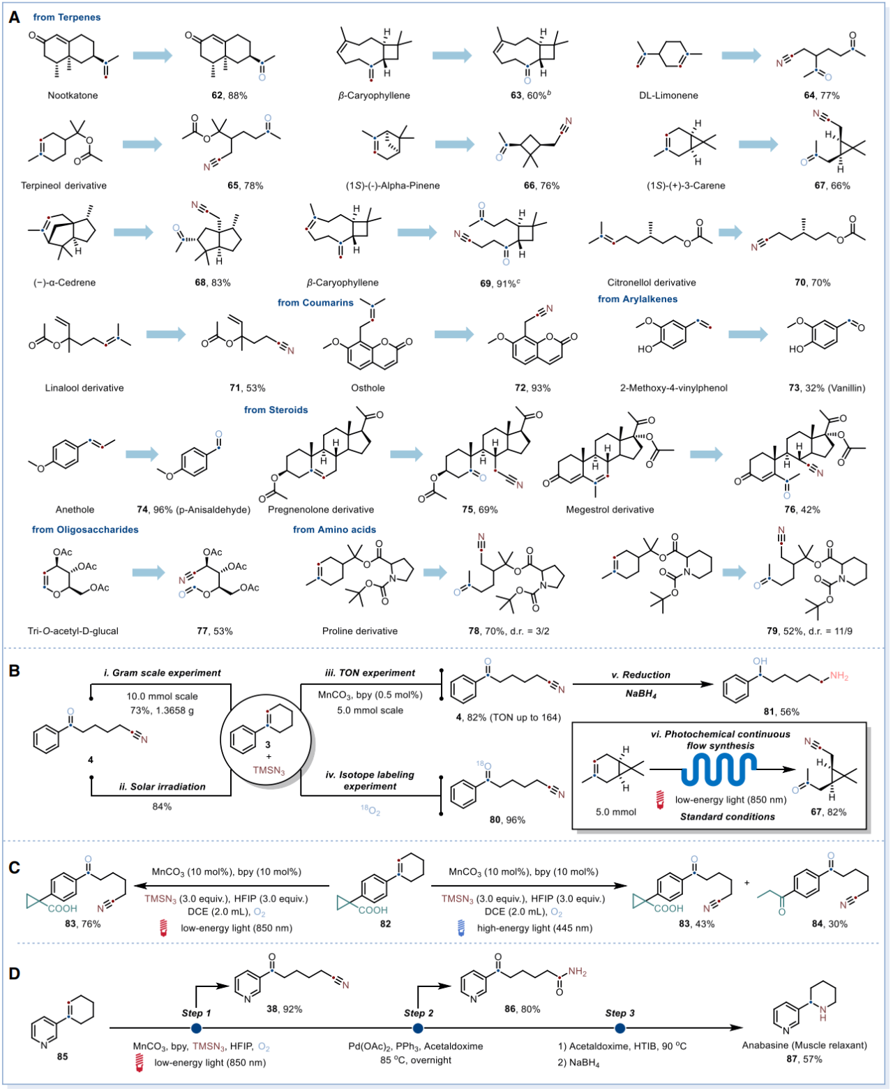 为了快速构建理想的锰基低能量光催化平台,作者通过UV-Vis实验快速筛选出有效的低能量光吸收组分,并在低能量光照射下,通过自由基捕获实验证实了叠氮自由基的产生。基于此发现,团队期望将研究体系拓展至烯烃的氮化转化,并通过理论计算建立了合理的反应路径。在这一模型的指导下,作者获得了可将环状烯烃转化成酮腈的最佳条件。此外,作者还开展了一系列的机理实验,进一步阐释了反应的内在机制。