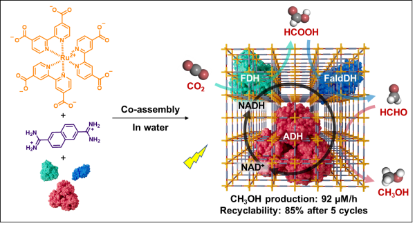 研究团队受羧酶体启发,通过水相中基于氢键相互作用的自组装,利用脒基单体、羧基单体与甲酸脱氢酶、甲醛脱氢酶及醇脱氢酶(ADH)的电荷增强氢键,通过原位一锅法共组装,实现基于多酶-光活性框架体系的人工光合系统制备。基于联吡啶钌基元的氢键有机框架,富集了光催化活性中心,能够在水相条件下实现高效的辅酶因子NAD+还原进而再生还原型辅酶Ⅰ(NADH),还原速率达4.5 mM/h。