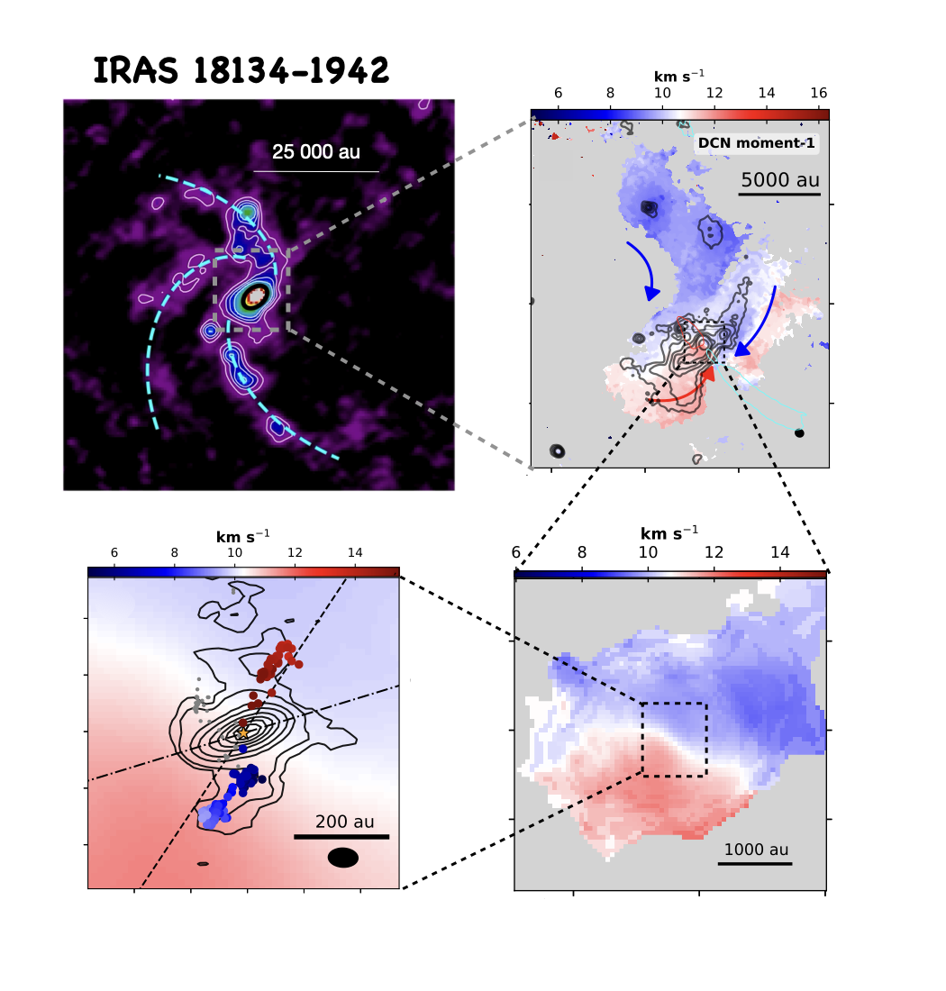 科研团队利用ALMA和VLA,对距离太阳约1.25千秒差距的大质量恒星形成区IRAS 18134-1942,进行多尺度高分辨率观测,揭示了“类旋臂-棒状-旋转包层—吸积盘”复合系统。在约2万天文单位尺度上,数条清晰的气体流将外围物质向核心输运,形成多条“旋臂”,部分气流符合旋转内落的运动特征,显示大尺度团块的整体旋转坍缩,可能在塑造气体内流形态和运动学方面起到关键作用;“旋臂”状气体流连接至一个约7500天文单位长的棒状结构,进一步将气体引导至核心区域;在约2000天文单位的核心范围内,气体形成旋转塌缩包层,并在约500天文单位范围内形成具有开普勒旋转运动特征的吸积盘。这是迄今为止首次在单个大质量气体团块中,同时揭示多个环节相互连接的完整层级气体系统,且与棒旋星系具有相似性。