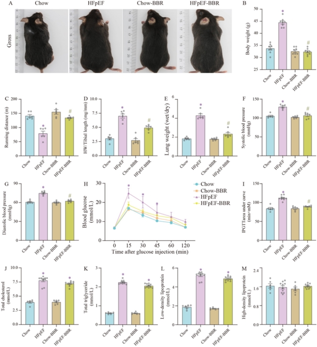 研究团队采用双打击小鼠模型模拟人类射血分数保留型心力衰竭的病理生理过程:给予成年雄性C57BL/6N小鼠高脂饮食联合一氧化氮合酶抑制剂L-NAME处理15周,随后每日灌胃给予小檗碱(50mg/kg)治疗4周。通过超声心动图检测发现,射血分数保留型心力衰竭模型小鼠出现左心室质量增加、室间隔和后壁舒张期厚度增厚,同时伴有舒张功能指标异常,表现为E波速度升高、e波速度降低、E/A比值和E/e比值升高(图1)。而小檗碱治疗显著逆转了这些舒张功能指标的异常,但对射血分数、短轴缩短率等收缩功能指标无明显影响,提示小檗碱对射血分数保留型心力衰竭的改善作用主要针对舒张功能障碍。