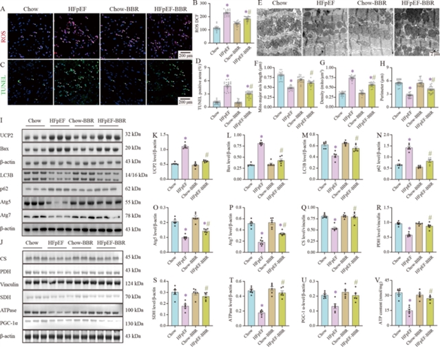 图4 普通饮食组和射血分数保留型心力衰竭小鼠有无小檗碱处理的心肌二氢乙锭染色、TUNEL染色、线粒体透射电镜超微结构与功能及自噬相关蛋白的蛋白质印迹分析