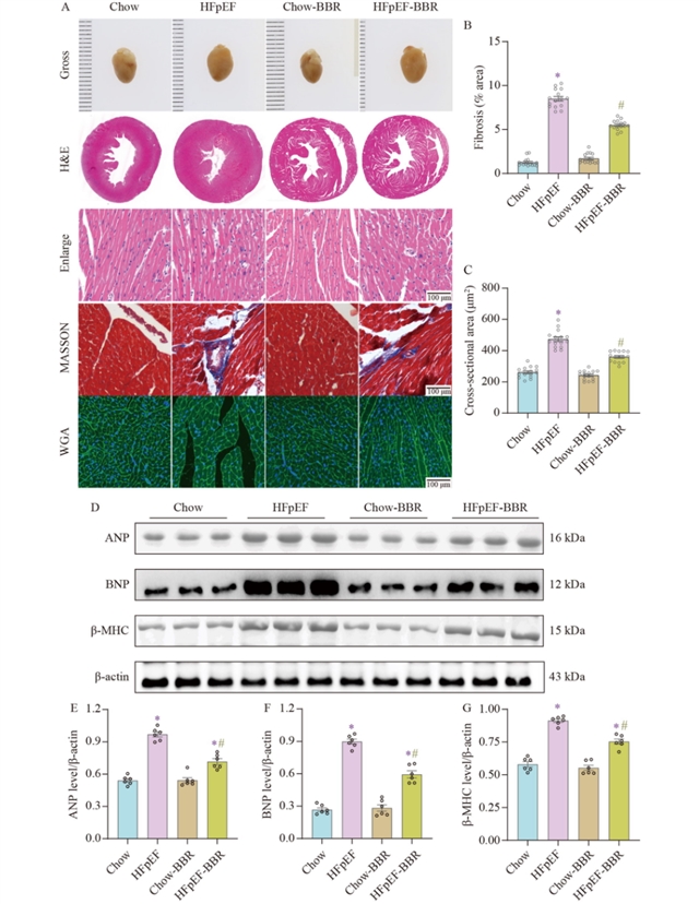 进一步研究发现,射血分数保留型心力衰竭模型小鼠表现出运动耐力下降、体重增加、血压升高及糖代谢紊乱,小檗碱处理后这些全身代谢异常得到了显著改善(图2)。此外,模型小鼠存在明显的心肌重构,包括心肌细胞横截面积增大和间质纤维化增加,同时心脏损伤标志物ANP、BNP和β-MHC的表达水平显著升高。小檗碱治疗有效减轻了心肌肥大和纤维化程度,并降低了这些损伤标志物的表达(图3)。