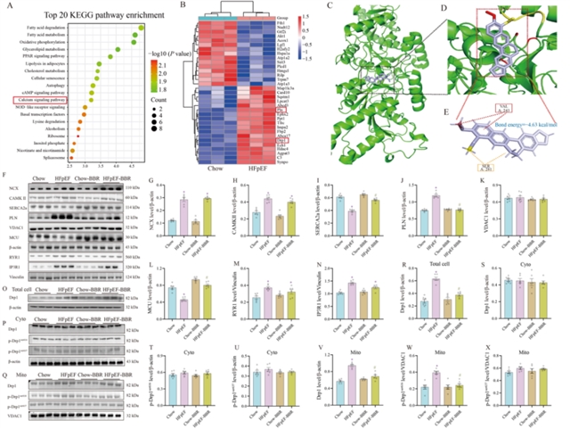 细胞内钙稳态失衡是导致射血分数保留型心力衰竭舒张功能障碍的核心机制。研究发现,射血分数保留型心力衰竭模型小鼠心肌肌浆网钙ATP酶2a(SERCA2a)表达降低,而受磷蛋白(PLN)表达升高,导致肌浆网钙重吸收能力下降,胞质钙超载。小檗碱治疗上调了SERCA2a的表达,下调了PLN的表达,促进胞质钙重吸收进入肌浆网,改善了钙稳态。同时,模型小鼠心肌线粒体钙单向转运蛋白(MCU)表达降低,小檗碱处理后MCU表达恢复,减轻了线粒体钙超载,进一步保护线粒体功能。