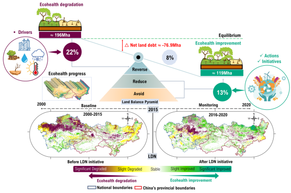 研究发现亚洲干旱区生态健康时空变化特征。土地退化是全球面临的严峻挑战,特别是在占地球陆地面积41%的干旱区。联合国2030年可持续发展议程将土地退化零增长(LDN)作为关键目标,要求在土地退化与恢复之间实现动态平衡。然而,以往针对亚洲干旱区的研究多侧重于评估“总退化量”,缺乏对“净平衡”(即退化与改善的抵消状况)的系统性、大尺度监测,这在很大程度上阻碍了科学研究成果向有效的政策实践转化。