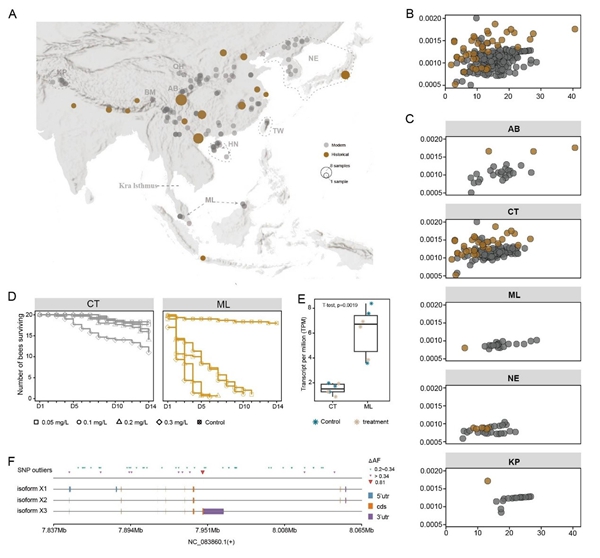 研究揭示东方蜜蜂多样性丧失和农药抗性演化。化学农药导致环境污染,并对蜜蜂等传粉昆虫造成威胁。通常,昆虫长期监测数据缺乏统一且可重复的采样方法,使学界对当前物种状况的不确定性进一步增加。博物馆标本中蕴含的遗传信息反映了特定历史时期目标物种及其群体的遗传信息,为解析近期人类活动对种群影响提供了宝贵的历史数据。昆虫的博物馆标本数量远高于其他类群,因而昆虫标本在解析近代人类活动影响中具有优势。