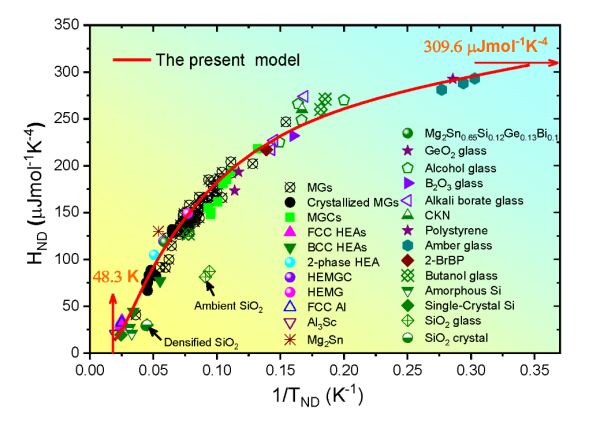 在此基础上,研究团队以散射体特征尺寸和散射声子平均自由程为参数空间,构建了非德拜声子异常的全景相图。分析发现,如果声子色散呈现非线性连续软化,则玻色峰和范霍夫奇点可由同一实体演变为高度耦合且可相互转换的两个变体;如果声子强烈散射导致色散出现额外的局域共振软化,则玻色峰和范霍夫奇点可作为完全不同的现象而独立地同时涌现,两者共存的相边界可由理论精确确定。研究团队还计算了非德拜声子异常引起的低温比热行为,并得到涵盖有序晶体到无序玻璃的143个真实固体的实验数据证实,这表明建立的声子统一理论具有广泛的普适性和有效性。