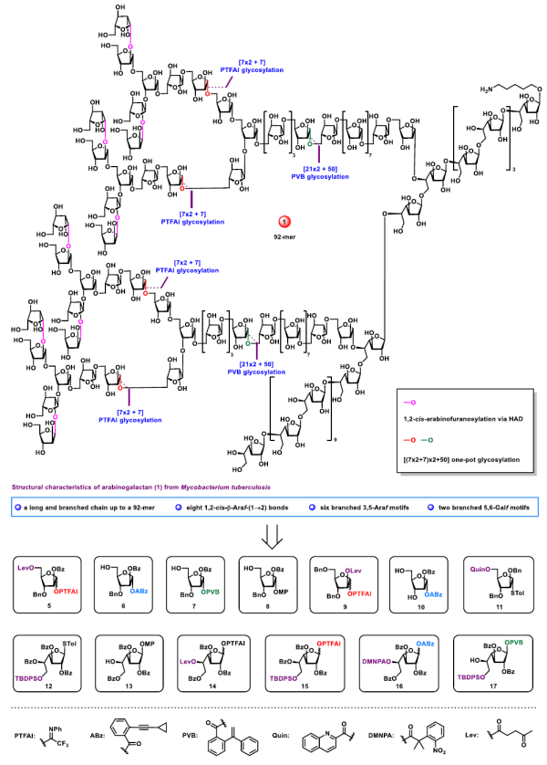 研究实现结核分枝杆菌阿拉伯半乳聚糖高达92糖的一锅法合成。结核病是由结核分枝杆菌感染引起的重要疾病,至今仍是全球重大公共卫生威胁。结核分枝杆菌表面覆盖着一层厚厚的蜡状细胞壁,对化学治疗药物的进入形成了一个巨大而复杂的屏障。抑制细胞壁的生物合成是当前一线抗结核药物的主要作用机制。阿拉伯半乳聚糖(AG)是结核分枝杆菌细胞壁的主要成分之一,是研发治疗结核病的药物、疫苗和诊断方法的重要分子。然而,AG多糖的结构复杂性和分子多样性使得其化学合成面临巨大挑战,也制约了对其生物活性的深入研究。