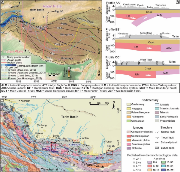 研究揭示印度-亚洲碰撞时限与青藏高原生长的关键证据。青藏高原隆升-生长过程是地球科学领域的核心科学问题。通常认为,青藏高原与印度克拉通在南部拉萨一带发生地表缝合,而深部地球物理观测则揭示,印度岩石圈正以近水平方式向北俯冲,其前缘已延伸至高原下方数百公里。接收函数研究进一步证实,印度板片的西段前端已抵达西昆仑之下。这一深部俯冲过程是驱动青藏高原西北缘新生代造山作用的关键,然而地表变形如何响应深部动力学过程,仍是学界争议的焦点。
