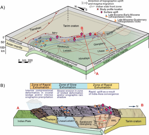 研究表明,11Ma–10Ma的快速隆升对应印度与塔里木板块的初始“硬碰撞”。该事件导致印度-欧亚板块汇聚速率在约11Ma后显著减缓并趋于稳定,同时引发了西昆仑地区在≤10Ma的(超)钾质岩浆活动,以及青藏高原和周缘造山带(如天山)在约11Ma普遍记录的隆升响应。值得注意的是,自渐新世以来,冷却年龄与(超)钾质岩浆活动年龄呈现出从高原内部(羌塘-拉萨地块)向西昆仑逐渐变年轻的趋势。这一时空演变规律受控于印度板块持续向北楔入亚洲的深部动力过程。印度板片的俯冲、碰撞及其后期撕裂,共同调控了高原的“向外生长”与“岩浆迁移”。
