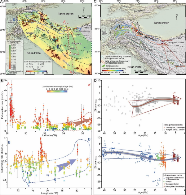 相关研究成果以Late Miocene rapid exhumation in the West Kunlun range: Insights into Tibetan Plateau growth and India-Asia lithospheric collision为题,发表在《地质学》(Geology)上。研究工作得到国家自然科学基金、第三次新疆综合科学考察、新疆维吾尔自治区重大专项等的支持。