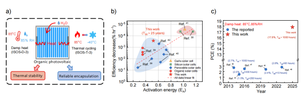 近日,中国科学院苏州纳米技术与纳米仿生研究所,针对有机光伏电池湿热和冷热循环极端环境稳定性提升需求,提出了从材料本征热稳定性筛选、器件功能界面优化、器件封装方法开发三个方面同步优化的系统解决策略,首次在85℃/85%RH湿热条件以及-40℃至85℃热循环条件下,实现高效率有机光伏电池优异稳定性,证实高效有机光伏电池的湿热及冷热循环可靠性。