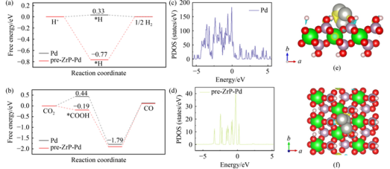 密度泛函理论(DFT)计算揭示了催化机制:磷酸锆载体与钯纳米颗粒间的强相互作用使钯的d带中心上移(从–1.98 eV升至–1.38 eV),增强了CO中间体的吸附能力,抑制了CO脱附和析氢反应的副反应。电荷密度差分析显示,载体向钯转移电子,进一步促进了CO的吸附与耦合。此外,CO2转化路径中,COOH→CO步骤的能垒升高,抑制了CO的生成,使*CO得以积累并通过C-C耦合生成乙醇。