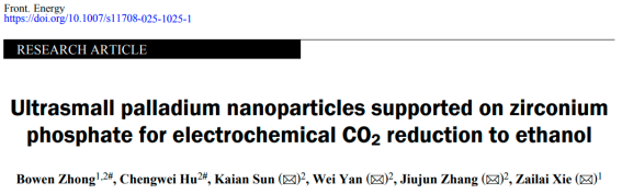 Bowen Zhong, Chengwei Hu, Kaian Sun, Wei Yan, Jiujun Zhang, Zailai Xie. Ultrasmall palladium nanoparticles supported on zirconium phosphate for electrochemical CO2 reduction to ethanol. Front. Energy, https://doi.org/10.1007/s11708-025-1025-1