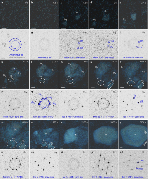 原位电镜发现冰异质成核结晶动力学路径。 结晶过程不仅是物理、化学、材料、生物等学科共同关注的重要科学问题,更与材料合成、能源转化与存储、量子信息与传感、生命起源与演化等诸多前沿交叉领域密切相关。然而,由于微观过程实验探测手段的限制,目前对结晶动力学路径的实时解析还十分困难,对其微观机制的理解仍不够深入,结晶研究在很大程度上仍处于黑箱状态。因此,发展具备原子尺度空间分辨和实时成像能力的原位显微技术,直接揭示结晶相变的微观动力学图像,对于理解晶体结构与形成机理、实现结晶过程的调控具有重要意义。