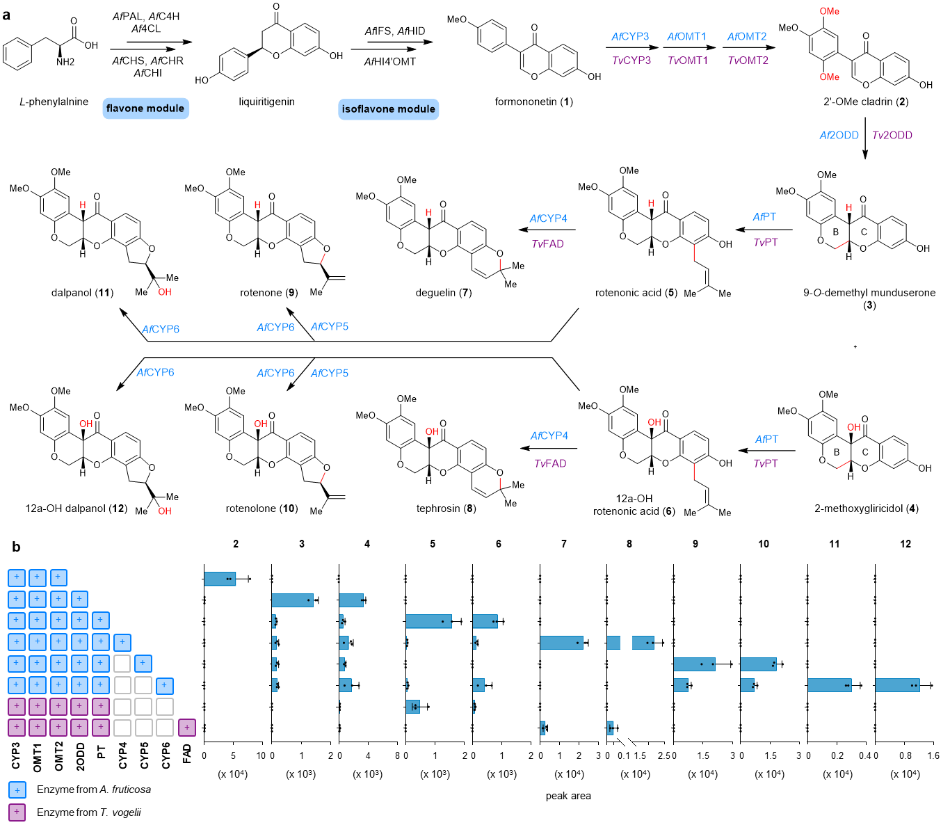 图5:烟草中工程化从头合成鱼藤酮类化合物。