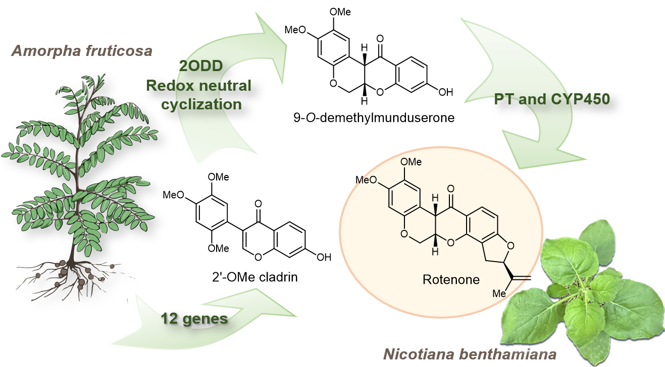 2025年10月21日,西湖大学洪本科团队在Nature Synthesis期刊上发表了题为Discovery and engineering of the biosynthesis of rotenoids的研究论文,完整阐明了豆科植物中鱼藤酮类天然产物的生物合成途径。该研究鉴定出一个关键的非典型2ODD氧化酶,该酶负责催化特征性顺式B/C环的形成,并揭示了其独特的氧化还原中性的环化机制。基于上述发现,研究团队在本氏烟草中成功构建了长达15个酶的反应途径,实现了六种鱼藤酮类化合物的从头合成。