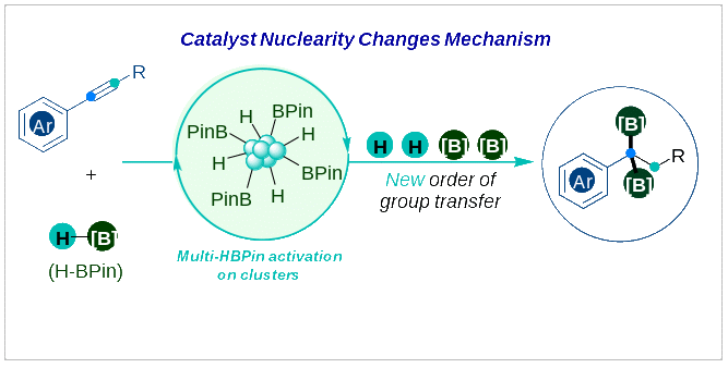 传统金属催化的炔烃与硼烷的双硼氢化反应,通常经历两次顺序的硼氢化步骤,涉及烯基硼中间体生成,并面临复杂的位点选择性挑战。研究团队采用简单镍前体与氟化铯添加剂,在不引入复杂配体情况下,实现了内式炔烃的高选择性双硼氢化。科研人员结合反应动力学诱导期、毒化实验、过滤实验、质谱分析、同步辐射XAFS表征及理论计算等,发现活性催化物种或为由多个镍原子组成的金属纳米团簇。该类团簇凭借其表面多金属中心的结构特征,可同时活化多个硼烷分子,从而突破经典单核金属催化剂一次仅能转移一对H与B的限制,并改变加成顺序,实现在单一催化循环中,依次完成H、H、B、B的加成过程。