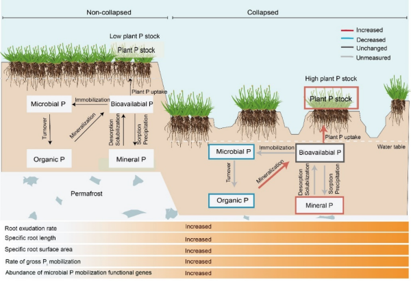 中国科学院植物研究所依托青藏高原多年冻土区热融塌陷联网观测平台,基于31P-NMR、33P同位素标记和宏基因组测序等技术,揭示了生态系统磷循环对冻土融化的响应及其关键驱动因素。研究发现,热融塌陷显著提高了表层土壤总磷活化速率,促进了植物磷吸收,进而加速了生态系统磷循环。