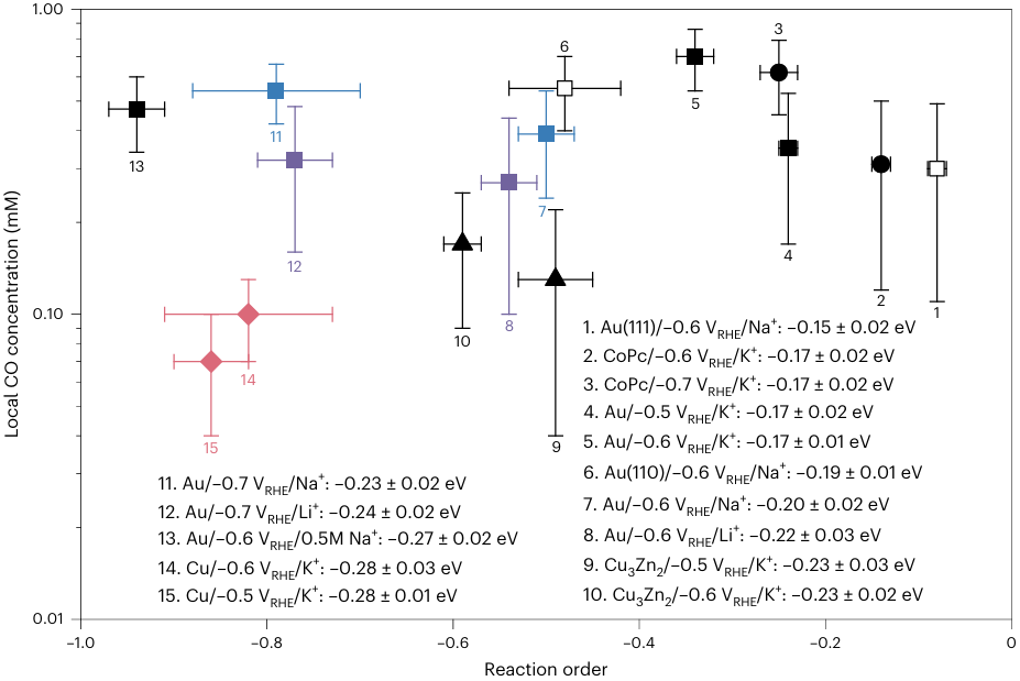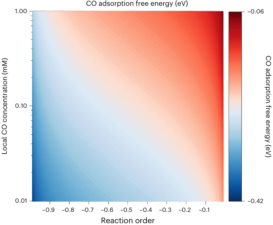 图1:CO2还原过程中,CO吸附自由能和CO反应级数与局部CO浓度的定量关系。(图片来源:Nature Catalysis)