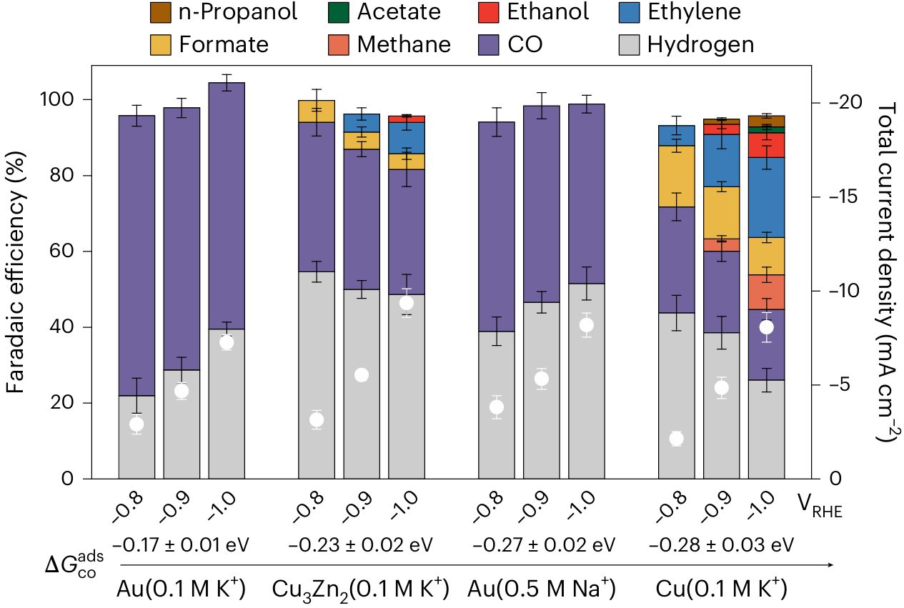 在不同的二氧化碳电还原催化剂上,产物选择性通常被认为与CO吸附能密切相关,因此CO吸附能常被视为预测不同催化剂选择性趋势的关键描述符。例如,金和银催化剂表现出对CO生成的高选择性,这被归因于它们相对较弱的CO结合强度,从而有利于CO的脱附。相反,铜对CO具有中等强度的吸附,被认为能够促进吸附态CO进一步还原为多碳产物。
