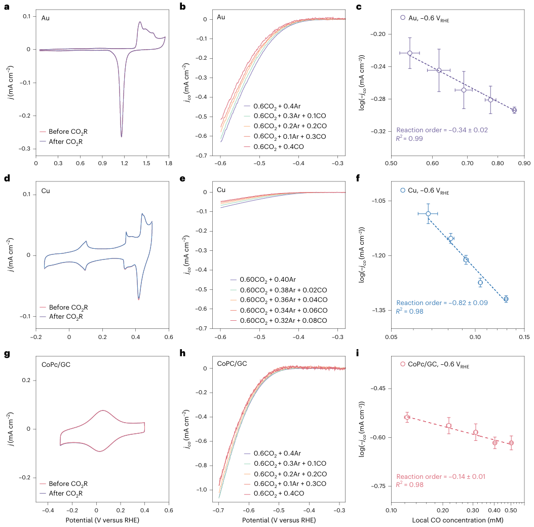 图2:比较三种不同催化剂(金,铜和钛氰钴)的CO反应级数和局部CO浓度。(图片来源:Nature Catalysis)