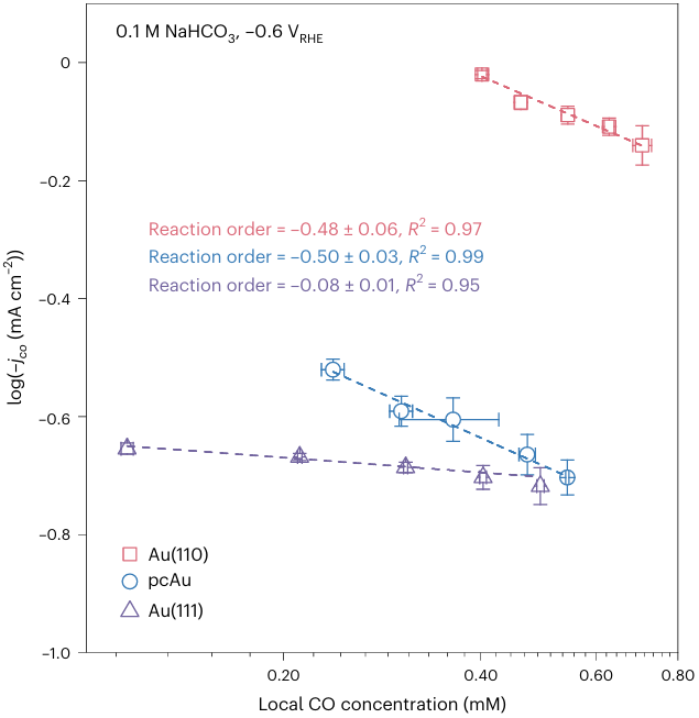 图4:金电极表面结构对于CO反应级数和局部CO浓度的影响。(图片来源:Nature Catalysis)