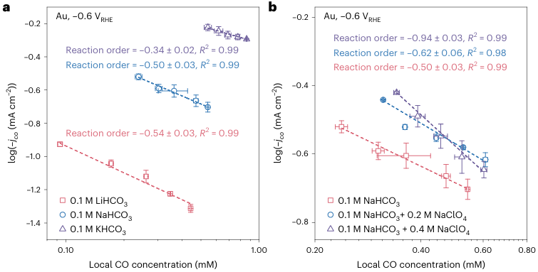图3:阳离子效应对于CO反应级数和局部CO浓度的影响。(图片来源:Nature Catalysis)