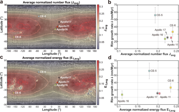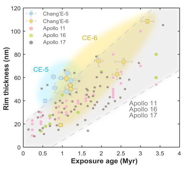 近日,中国科学院地球化学研究所、国家空间科学中心,联合澳门科技大学、云南大学、吉林大学,通过测定嫦娥五号(CE-5)与嫦娥六号(CE-6)月壤颗粒的暴露年龄及太阳风损伤非晶环带厚度,获得所测样品的环带增长速率,并与阿波罗11号、阿波罗16号和阿波罗17号样品的测量结果进行对比研究。