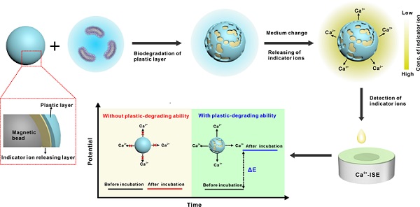 近日,中国科学院烟台海岸带研究所研究团队提出基于电化学传感的菌株塑料降解能力快速定量评估策略,用于对聚苯乙烯降解菌株的快速识别。研究将聚合物膜离子选择性电极与磁分离技术相结合,利用菌株降解塑料导致指示离子释放,通过高灵敏检测指示离子浓度变化实现对菌株降解塑料效率的间接电化学检测。