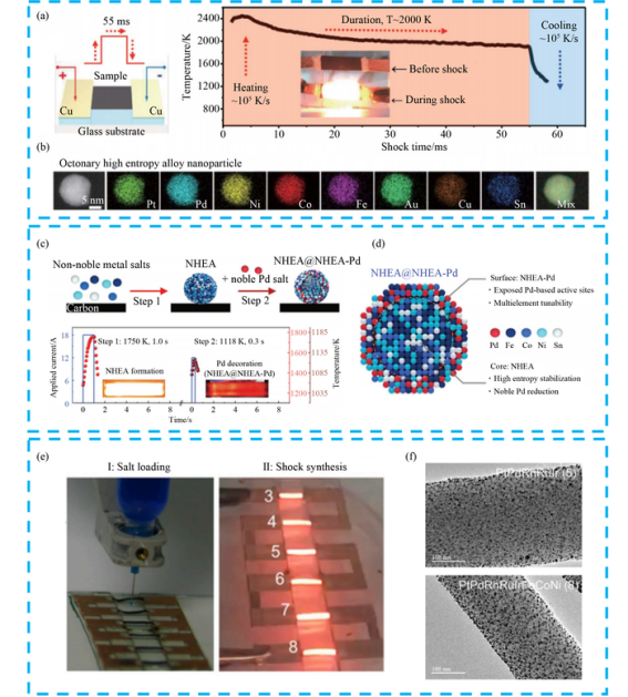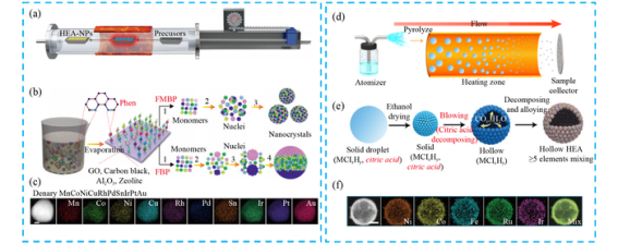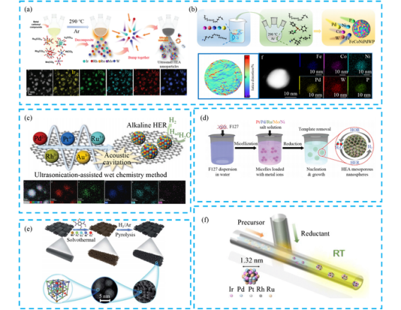 合成方法是高熵合金研究的重要基础。碳热冲击法(CTS)通过超高温快速加热与淬火,促进元素均匀混合并抑制相分离,可制备单相高熵合金纳米颗粒,例如通过两步热冲击法合成的核壳结构高熵合金(NHEA@NHEA-Pd),其表面暴露出更多的贵金属活性位点,内部非贵金属核保持高熵结构稳定性。湿化学法利用溶液相反应实现金属前驱体还原,通过溶剂选择、超声辅助或连续流反应等技术,可合成小粒径、形貌均一的高熵合金纳米颗粒,如采用油胺溶剂合成的IrRuRhMoW高熵合金在析氢反应中表现优异。热解法分为平衡与非平衡两类,平衡热解可通过调控温度、时间等条件实现热力学平衡下的合金化,例如通过热退火将核壳结构金属纳米颗粒转化为单相高熵合金;非平衡热解则利用快速加热实现非平衡态元素的均匀分布,可制备10元高熵合金纳米颗粒。此外,激光烧蚀、微波加热、溅射沉积及冻融法等技术也为高熵合金的多样化制备提供了途径。
