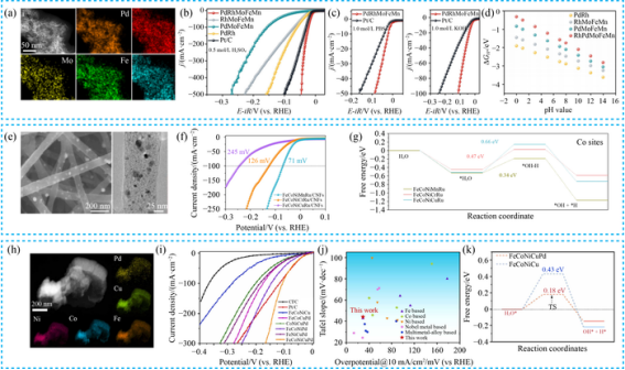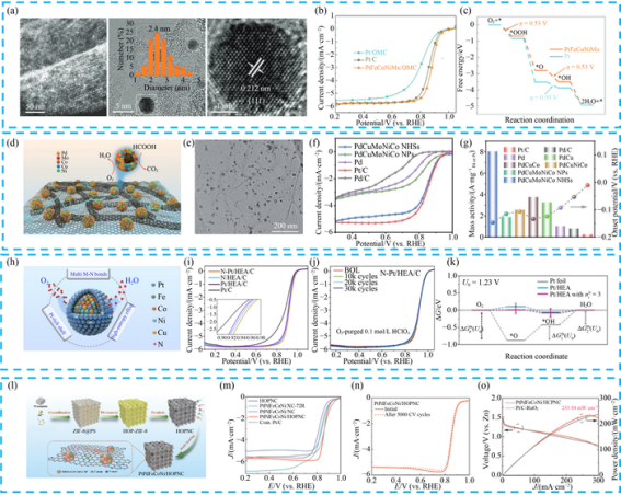 在具体应用方面,高熵合金在ORR中展现出优异性能。例如,碳负载的PtFeCoNiMn高熵合金(PtFeCoNiMn/OMC)在酸性介质中半波电位(E1/2)达0.88 V,质量活性1.12 A/mgPd,远超商业Pt/C催化剂,其稳定性得益于多组元电子相互作用抑制了活性金属的溶解。在HER中,PdRhMoFeMn高熵合金在酸性、中性及碱性条件下的过电位(η10)分别低至6 mV、23 mV与26 mV,优于Pt/C,DFT计算表明Rh位点的氢吸附自由能(ΔGH*)接近0 eV,多组元协同优化了吸附与脱附过程。在CO2RR中,AgAuCuPdPt高熵合金在-0.3 V下可将CO2完全转化为气态产物,电流密度达-13.81 mA/cm2;PdCuAuAgBiIn高熵气凝胶(HEAAs)的甲酸法拉第效率(FEHCOOH)高达98.1%,其多孔结构与多组元协同促进了HCOO*中间体的吸附与脱附。